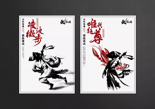 在設(shè)計(jì)上將大蝦秘籍的概念,融入了各式餐飲品牌VI設(shè)計(jì)物料內(nèi),并且延續(xù)中國風(fēng)武俠的實(shí)際風(fēng)格,化繁為簡,讓品牌升級(jí)更完整。
