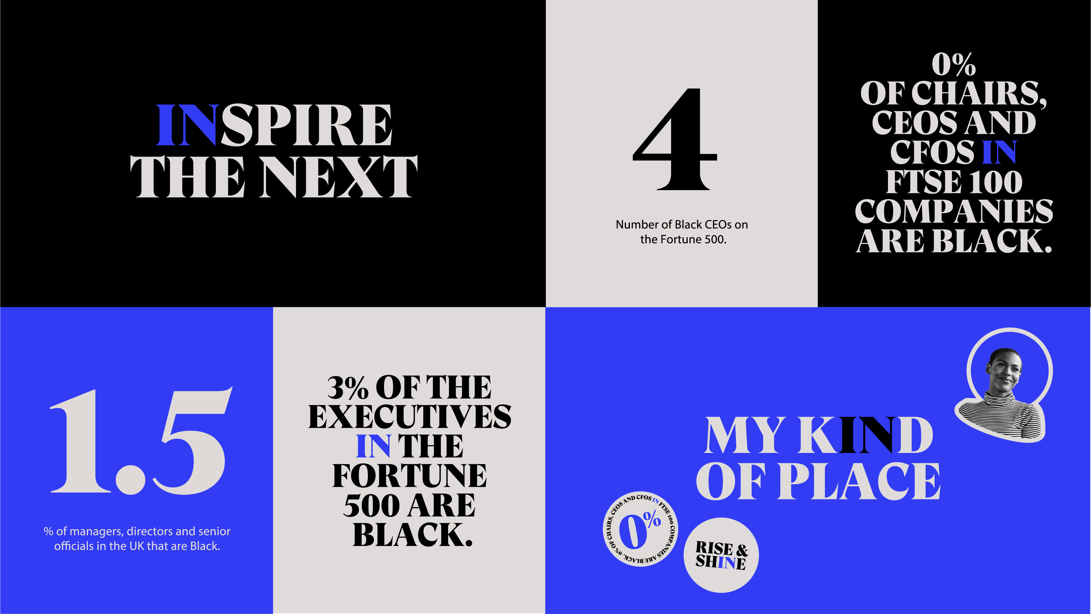 在為倫敦商學(xué)院(London Business School)舉辦的“女性商務(wù)會(huì)議”視覺(jué)識(shí)別(Equall)會(huì)議上工作過(guò)之后,“黑衣人”(Black In Business)創(chuàng)始人Tabria Lenard和科爾·阿格貝德(Cole Agbede)接洽了“風(fēng)暴品牌”(StormBrands),以創(chuàng)建一個(gè)全球品牌形象設(shè)計(jì),讓這一在富時(shí)100指數(shù)成份股公司中,被任命為史蒂夫的CEO比黑人CEO還要多,8家公司占富時(shí)100指數(shù)成份股公司董事的25%,黑人在商業(yè)中所代表的不僅僅是一個(gè)學(xué)生俱樂(lè)部和一所商學(xué)院,它需要的是一股推動(dòng)積極變革的力量,以及一份明確的意向聲明,以激勵(lì)更美好的未來(lái)。