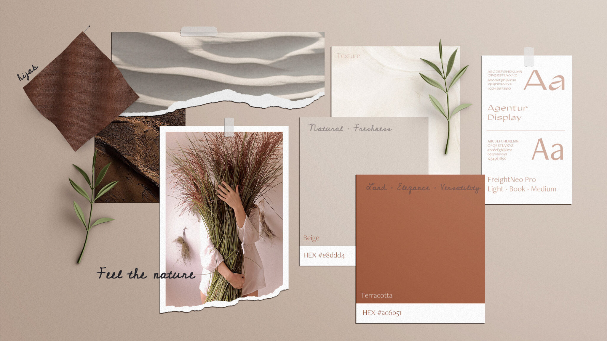 品牌形象設(shè)計(jì)中顏色調(diào)色板是基于中性色調(diào)的頭巾,以及女性化的一面的品牌。除了這些特點(diǎn),北歌色調(diào)傳達(dá)自然,并與自然生物降解織物。反過來,粉紅色調(diào)尋求更女性化的一面,甜蜜,浪漫。