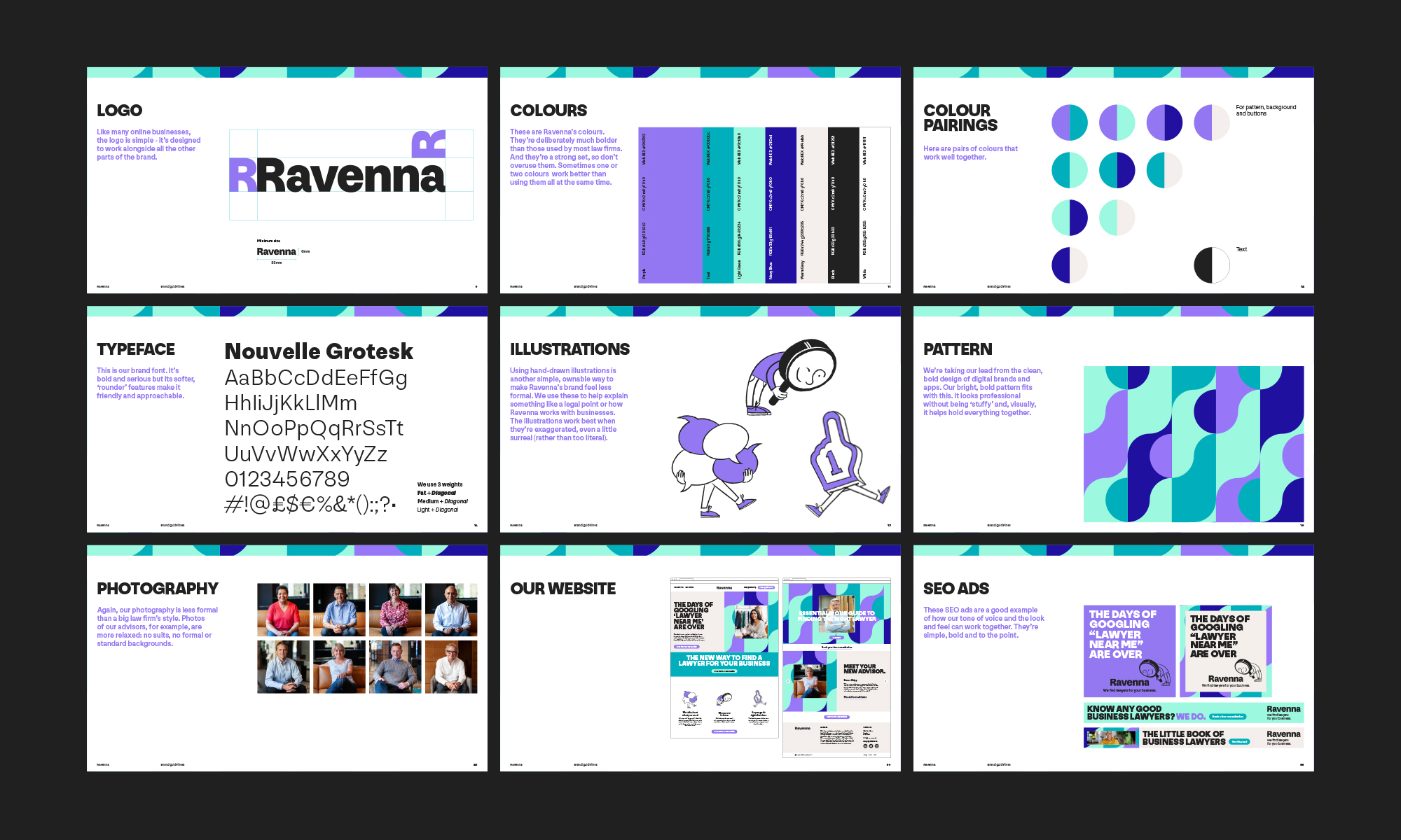 我們與超級語音專家 We All Need Words 合作,為 Ravenna 創(chuàng)建了一個(gè)大膽而引人入勝的視覺標(biāo)識設(shè)計(jì)。這是一個(gè)為通常被認(rèn)為是安全的世界創(chuàng)造新事物和有趣事物的機(jī)會。我們希望給 Ravenna品牌形象設(shè)計(jì) 一個(gè)既不同、獨(dú)特又多彩的外觀和感覺,以幫助將一家律師事務(wù)所帶入數(shù)字世界,并避免與該行業(yè)相關(guān)的任何常見的刻板印象。由于這是針對新成立的企業(yè),它需要吸引新的和現(xiàn)代的觀眾,他們不怕與眾不同并探索新的途徑。