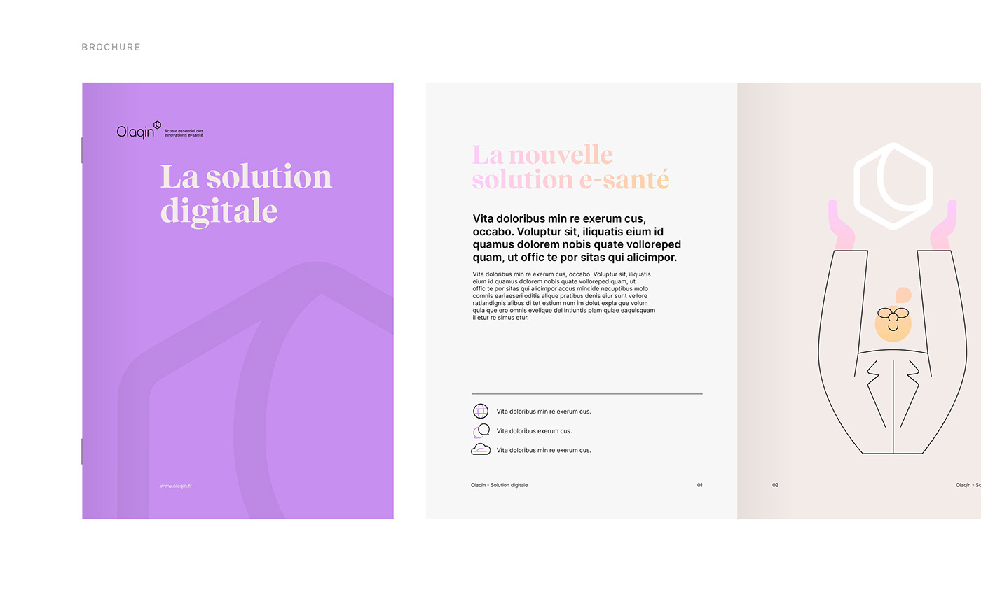 到目前為止,公司指南使用的是從圖像庫(kù)中獲取的非個(gè)人圖像。新品牌形象設(shè)計(jì)的圖像將體現(xiàn)護(hù)理和醫(yī)療護(hù)理的照片與色彩繽紛、富有詩(shī)意的插圖結(jié)合在一起。主要目標(biāo)是提出一個(gè)獨(dú)特的圖像,傳達(dá)為患者和衛(wèi)生專業(yè)人員提供界面服務(wù)的理念。Recif 字體的實(shí)線和流暢線條的有機(jī)品質(zhì),結(jié)合其襯線的粗糙度,為布局提供了靈活性。這種印刷選擇與通常用于數(shù)字的“無(wú)襯線”印刷風(fēng)格形成鮮明對(duì)比。這是使品牌人性化的印刷選擇。柔和的色彩環(huán)境對(duì)應(yīng)著奧拉欽運(yùn)作的醫(yī)療宇宙的護(hù)理功能。漸變直接喚起了品牌服務(wù)的數(shù)字背景。