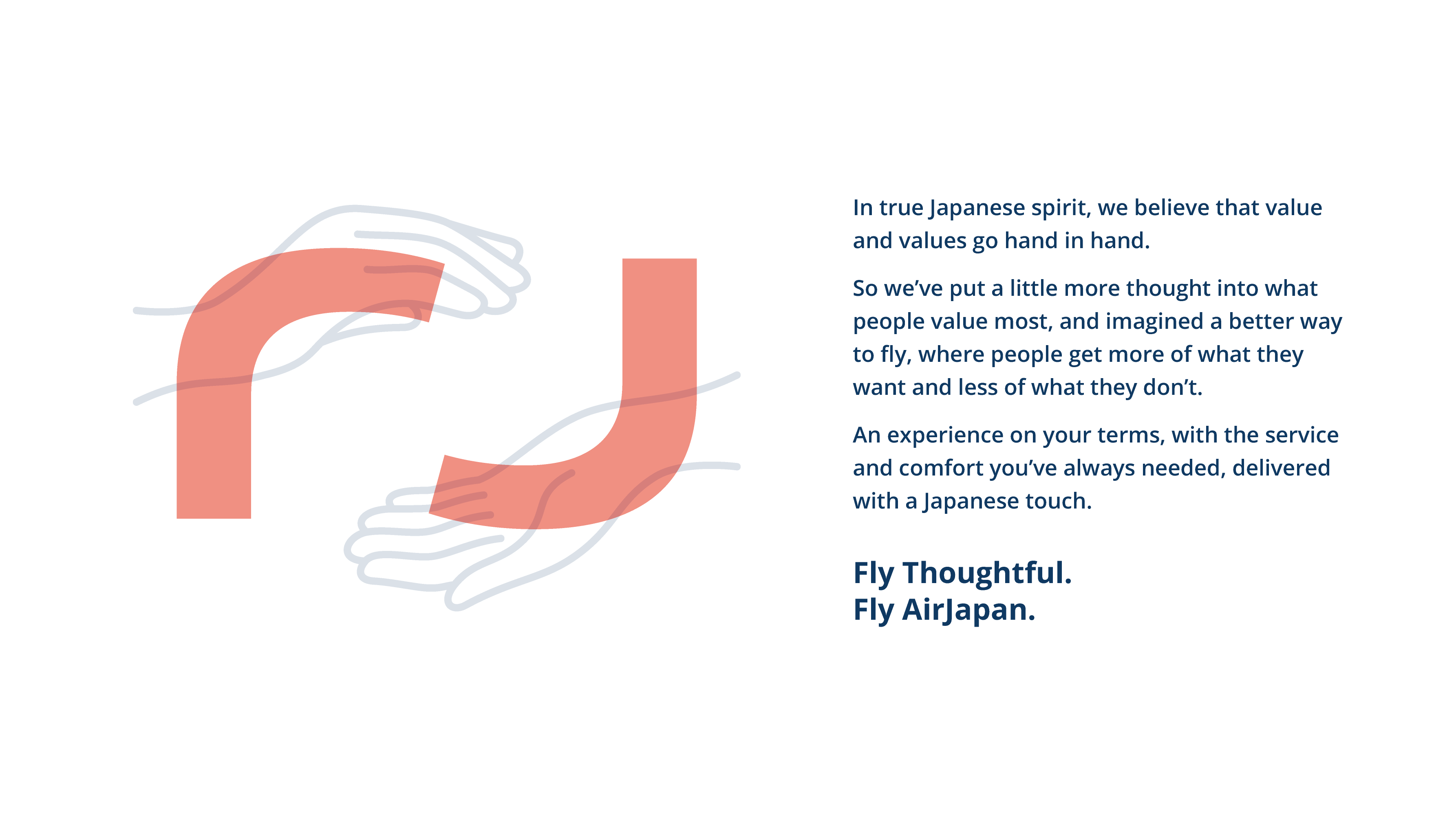 我們的目標(biāo)是創(chuàng)造一種全新的航空旅行體驗,既不是全方位服務(wù)也不是低成本航空公司 (LCC),結(jié)合了兩全其美,同時還具有日本風(fēng)格的理念和品質(zhì)。品牌理念可以用“Fly Thoughtful”這句話來概括,表達(dá)了航空公司的關(guān)懷、體貼和溫柔的態(tài)度。作為一家對所有人友好和關(guān)懷的航空公司,我們的目標(biāo)是基于日本理念和對質(zhì)量的承諾,創(chuàng)造一種全新的航空旅行體驗。