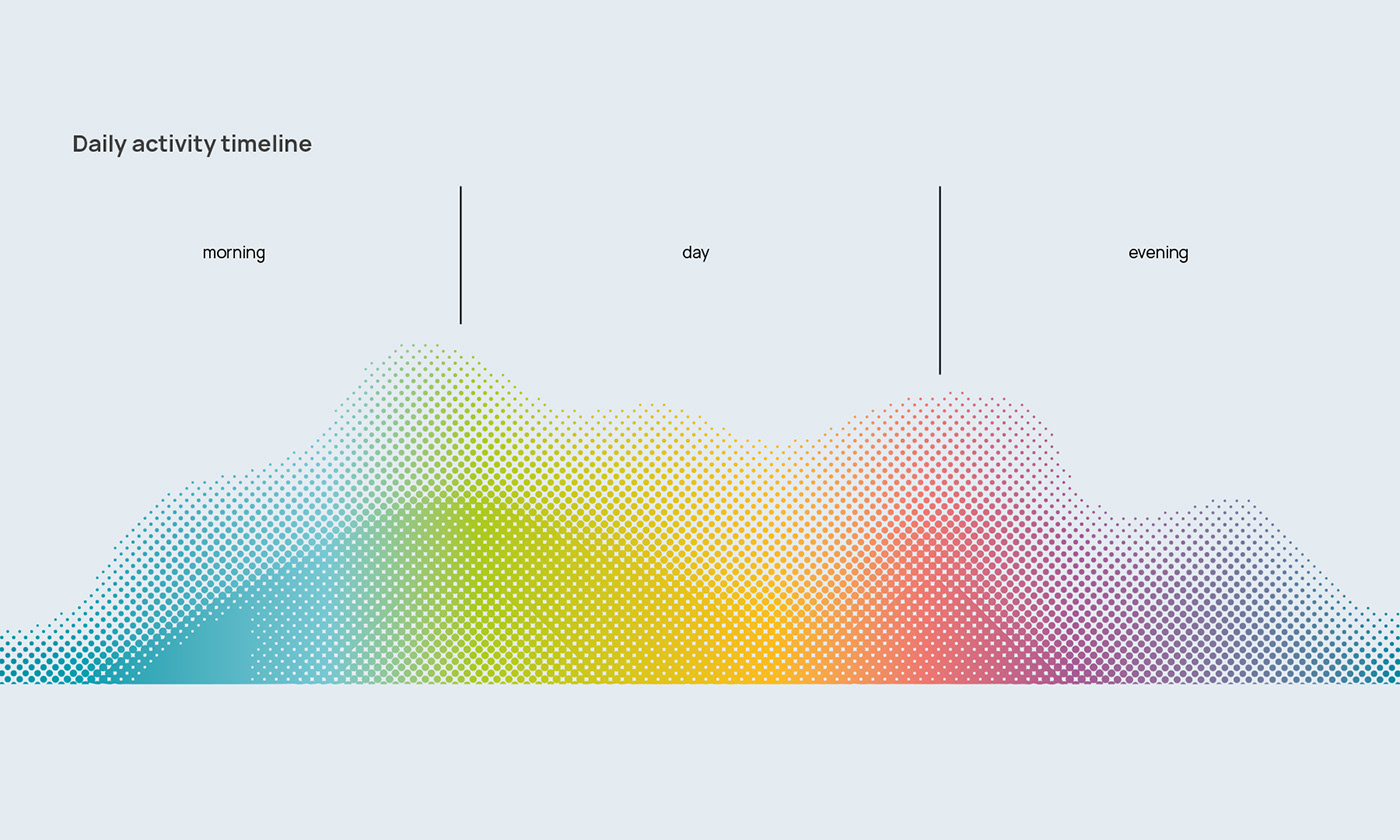 我們發(fā)現(xiàn)日?;顒?dòng)的時(shí)間表有規(guī)律,有生命周期和自然現(xiàn)象,如季節(jié)的變化。這張圖表構(gòu)成了Mindsupply設(shè)計(jì)的基礎(chǔ)包裝設(shè)計(jì)。最初的模糊字體解決方案支持精神狀態(tài)可變性的觀點(diǎn)。