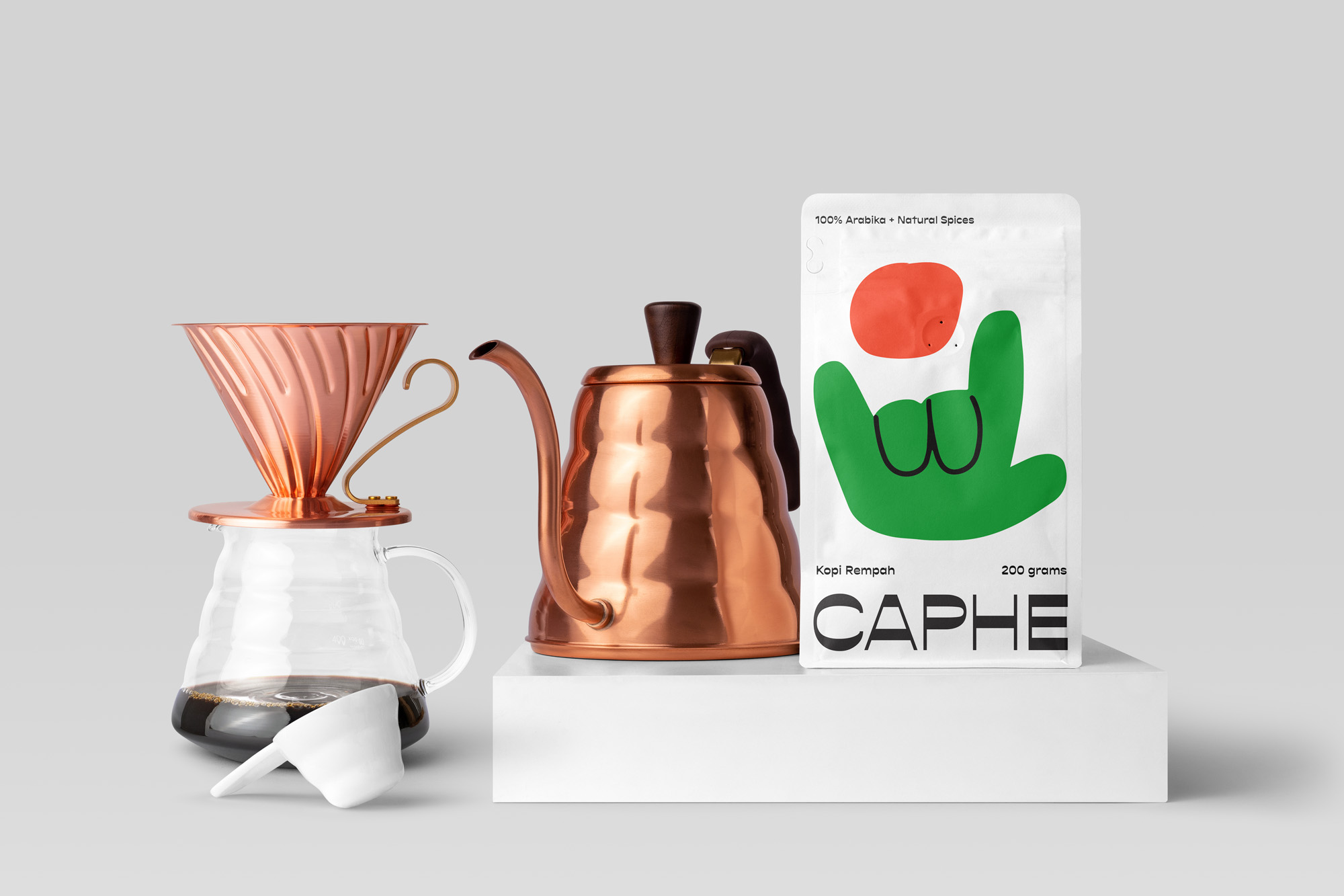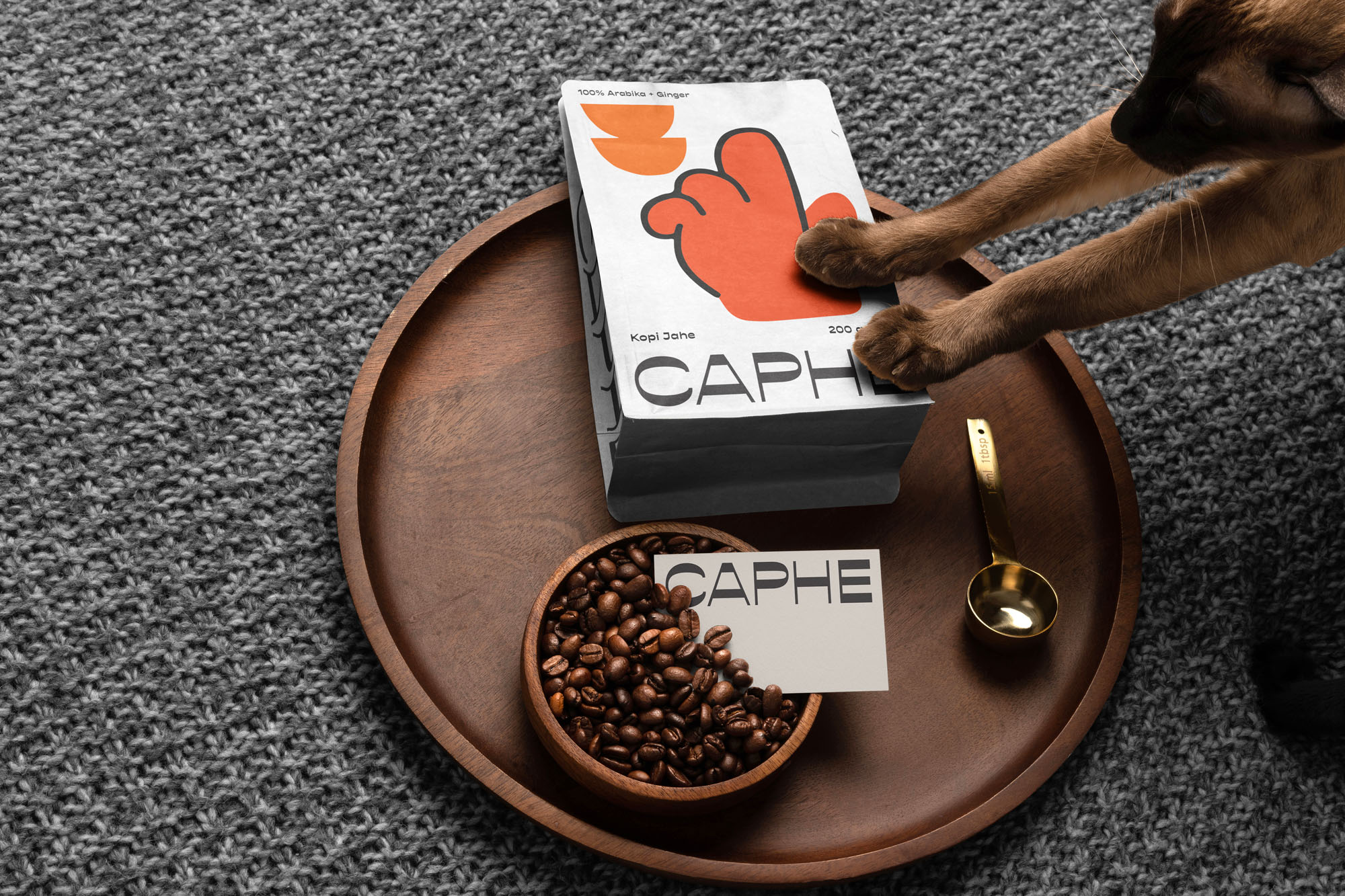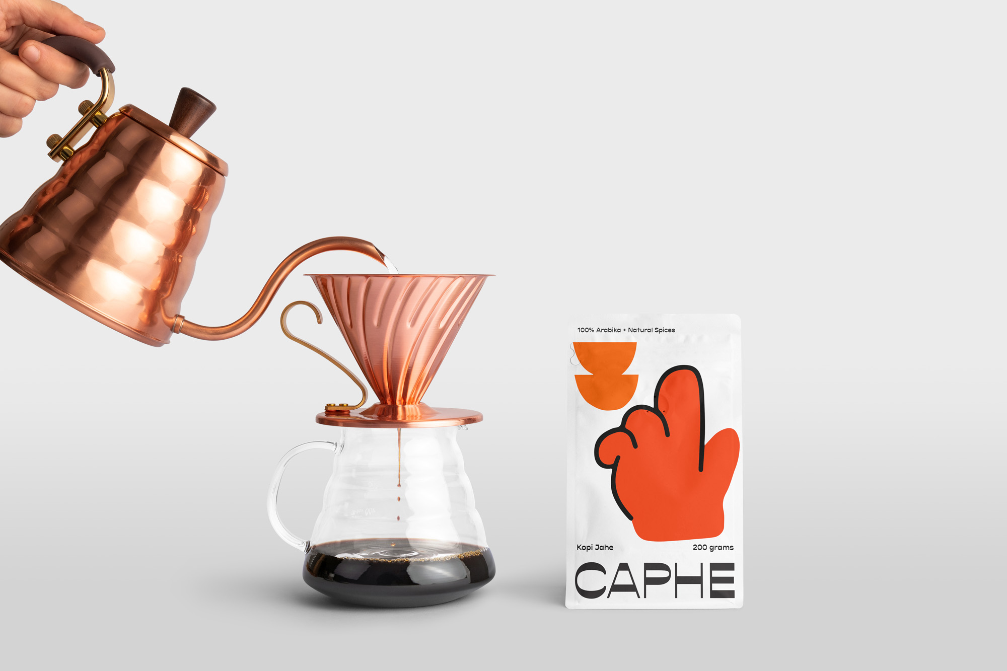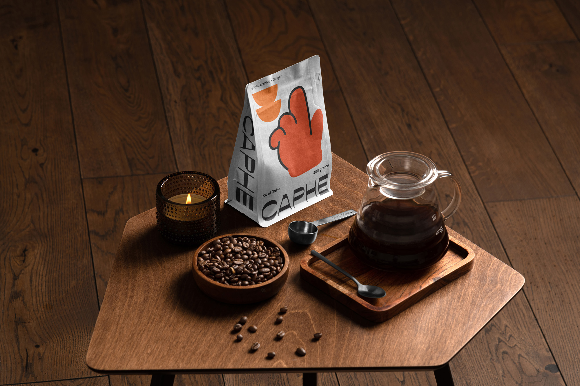 我們選擇Opposit作為Caphe的字體,這種字體是獨一無二的,字母的每個字符上都有粗而細的筆畫。在包裝設(shè)計中,我們試圖拋開以咖啡為基礎(chǔ)的包裝設(shè)計思想。與大多數(shù)咖啡設(shè)計不同,姜汁咖啡自動地以姜汁插圖為特色,這太普通和無聊了。我們設(shè)計了一個手勢的插圖,作為享受咖啡的滿足感的標志。除了是包裝上的一個身份和設(shè)計,這個插圖也是一個附屬于品牌的圖像。它與眾不同,獨一無二,引人注目。