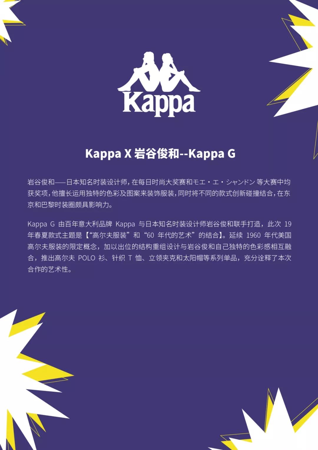 Kappa品牌于1916年在意大利誕生,早在20世紀(jì)6、70年代開始便在歐洲嶄露頭角,隨后逐步發(fā)展為歐洲最具盛名的運(yùn)動及休閑服裝品牌。而Kappa品牌所代表的運(yùn)動、青春及熱情的生活方式,也早已隨著品牌極具識別度的品牌標(biāo)識——兩名背靠背而坐的男女為全世界所熟知。