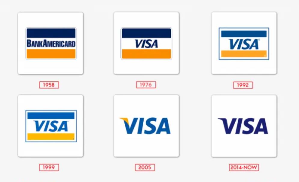 在過去的40年中,品牌的視覺形象沒有太大變化。帶有“Visa”字樣的標(biāo)志最早出現(xiàn)在20世紀(jì)70年代中期,經(jīng)過了一些小的重新設(shè)計(jì)。在此之前,也使用了類似的品牌,但帶有“BankAmericard”字樣。1958年至1976年