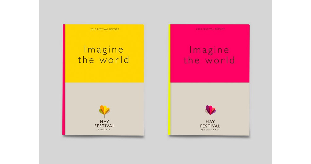 “Hay Festival”以無襯線字體出現(xiàn)在樹旁或樹下的堆疊線條中,以大寫字母排列,威勒稱其為“經(jīng)典”,帶有“烏托邦式的感覺”。核心標識的每一根樹枝都被設置成不同的顏色,包括紫色、粉色、橙色和黃色。該標志以多種顏色出現(xiàn),代表了該節(jié)日分支的不同地點,比如西班牙塞戈維亞姐妹節(jié)的不同黃色色調,以及秘魯阿雷基帕的一系列紫色。威勒表示,logo選用了“充滿活力”的調色板,背景采用了“更平靜”的色調,用以鼓舞和娛樂人們。
