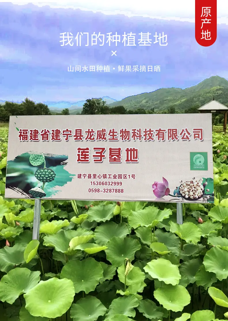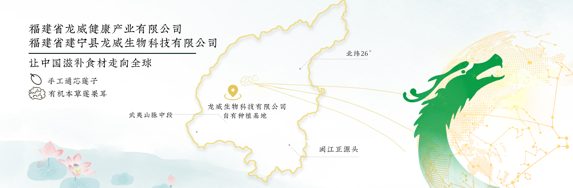 龍威貢牌是福建省建寧縣龍威生物科技有限公司的品牌。公司位于福建閩西北,具有得天獨(dú)厚優(yōu)良?xì)夂蚺c環(huán)境.地處閩江源頭,閩江源頭的水質(zhì)極佳,無污染。龍威貢牌蓮子,龍威貢牌銀耳(白木耳)就是用閩江最源頭的水灌溉著。其蓮子粒大,粉.嫩.香。銀耳口感似燕窩,富含豐富的植物膠質(zhì),享素食燕窩之美譽(yù)。公司已建成農(nóng)場化蓮子基地1000多畝,銀耳(白木耳)種植基地200畝,專業(yè)計術(shù)員工廠化統(tǒng)一管理,種植過程中不使用化肥農(nóng)藥,產(chǎn)品全部可經(jīng)國際檢測SGS機(jī)構(gòu)檢測368項農(nóng)殘合格,主要出口到美國,臺灣,日本,香港.新加坡。